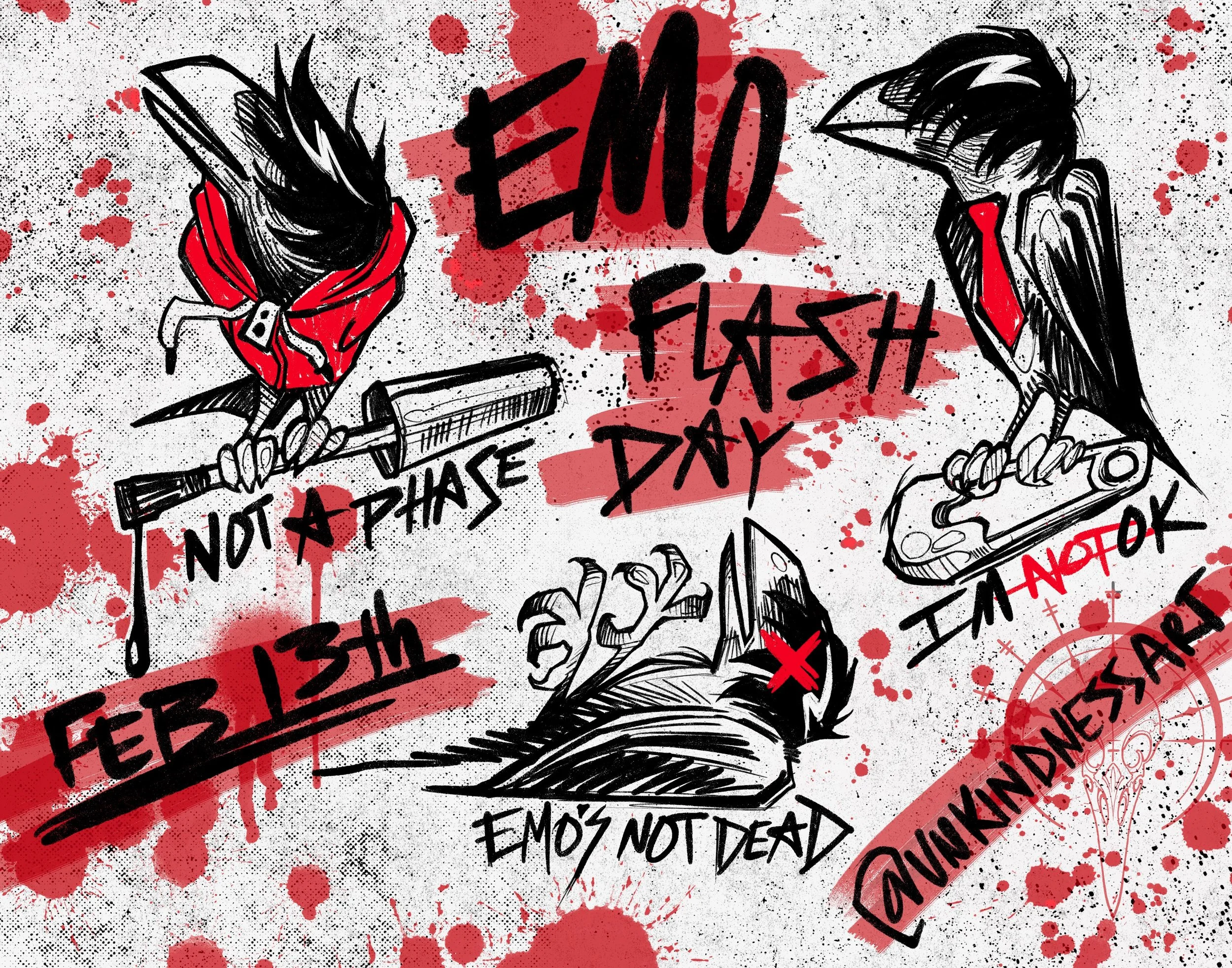 It's the first Friday the 13th of the season, and we're celebrating with a very special, very emo, early Valentine's flash day! Time to straighten those bangs, pull on your skinniest jeans, paint your nails black, and relive all your teenage angst with us here at Unkindness Art. Because what's more emo than getting a new tattoo?!