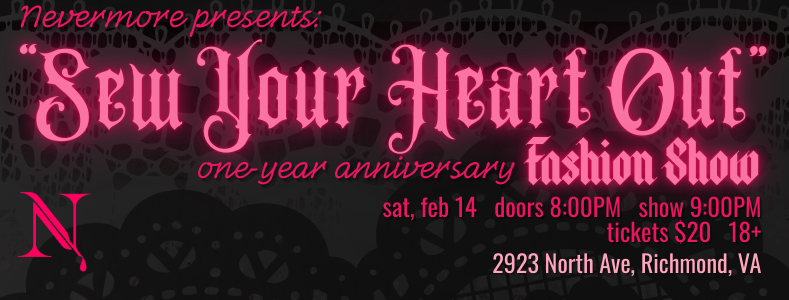 In celebration of their one-year anniversary, our sister store Nevermore Gothic Boutique & Micro Gallery would like to formally invite you to join us this Valentine’s Day for “Sew Your Heart Out,” an evening of hauntingly beautiful fashion that’s sure to steal your heart away!